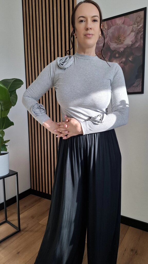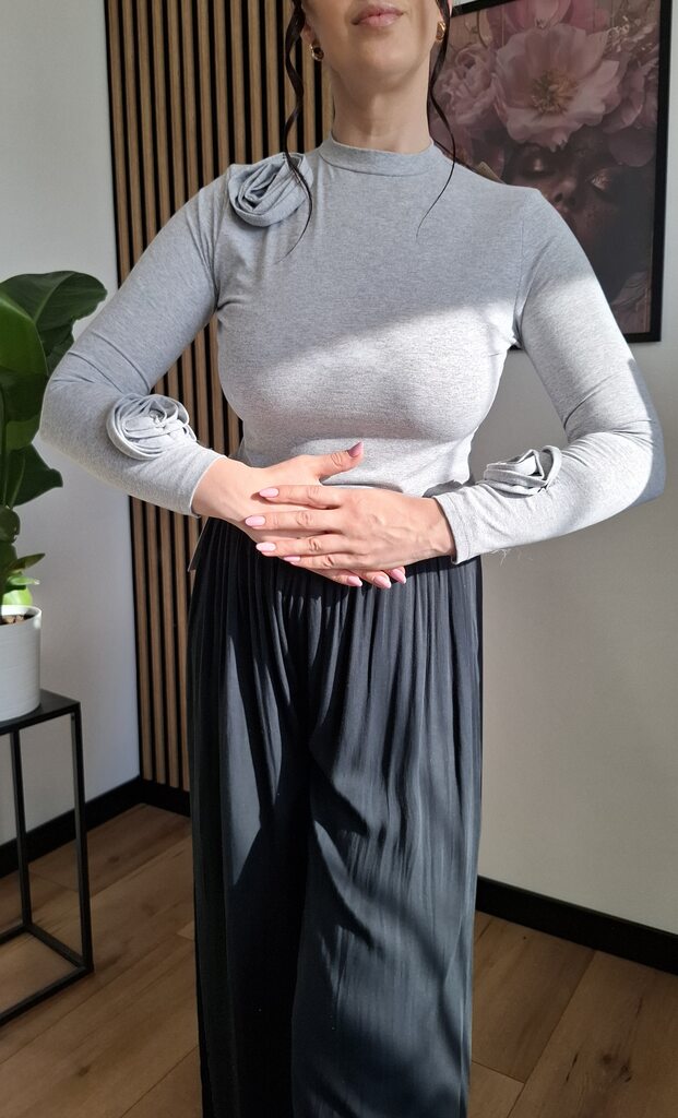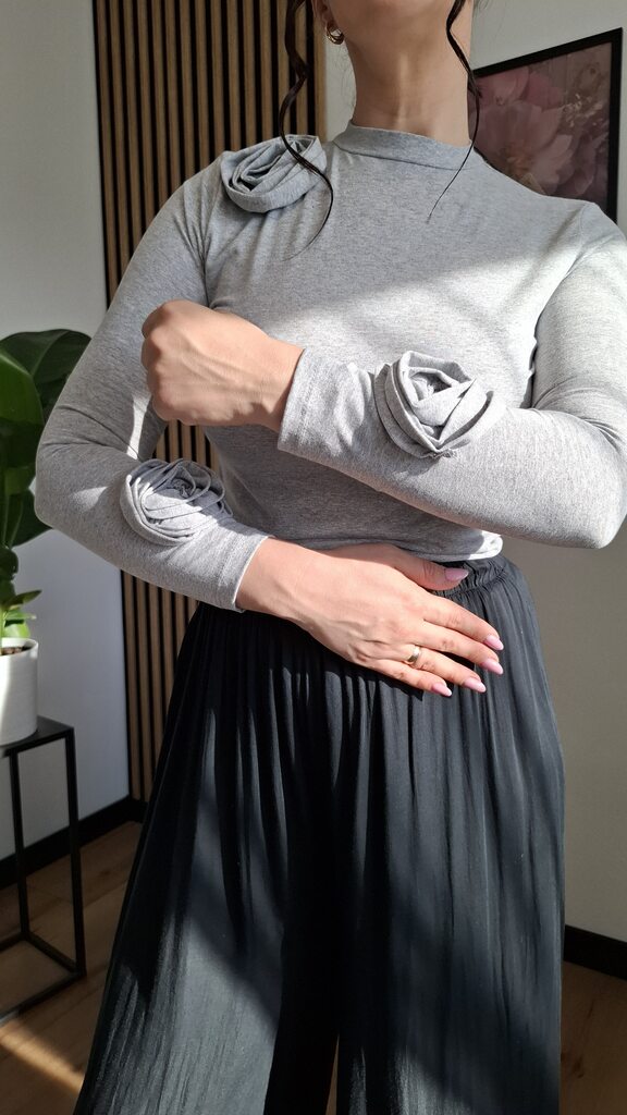 Dopasowana bluzka z długim rękawem, wykonana z przyjemnej, bawełnianej tkaniny. Model wyróżnia się efektownymi zdobieniami – doszytymi różami na rękawach oraz na ramieniu, które nadają całości wyjątkowego, kobiecego charakteru.