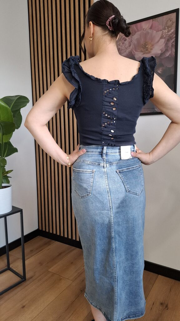 Lekka i przewiewna bluzka wykonana z bawełny, idealna na cieplejsze dni. Model bez rękawów z uroczą falbanką przy ramionach oraz efektownym, ażurowym tyłem, który dodaje całości delikatności i wyjątkowego charakteru.
