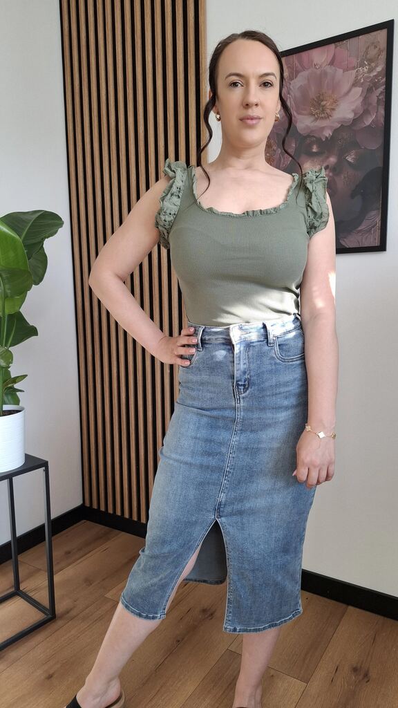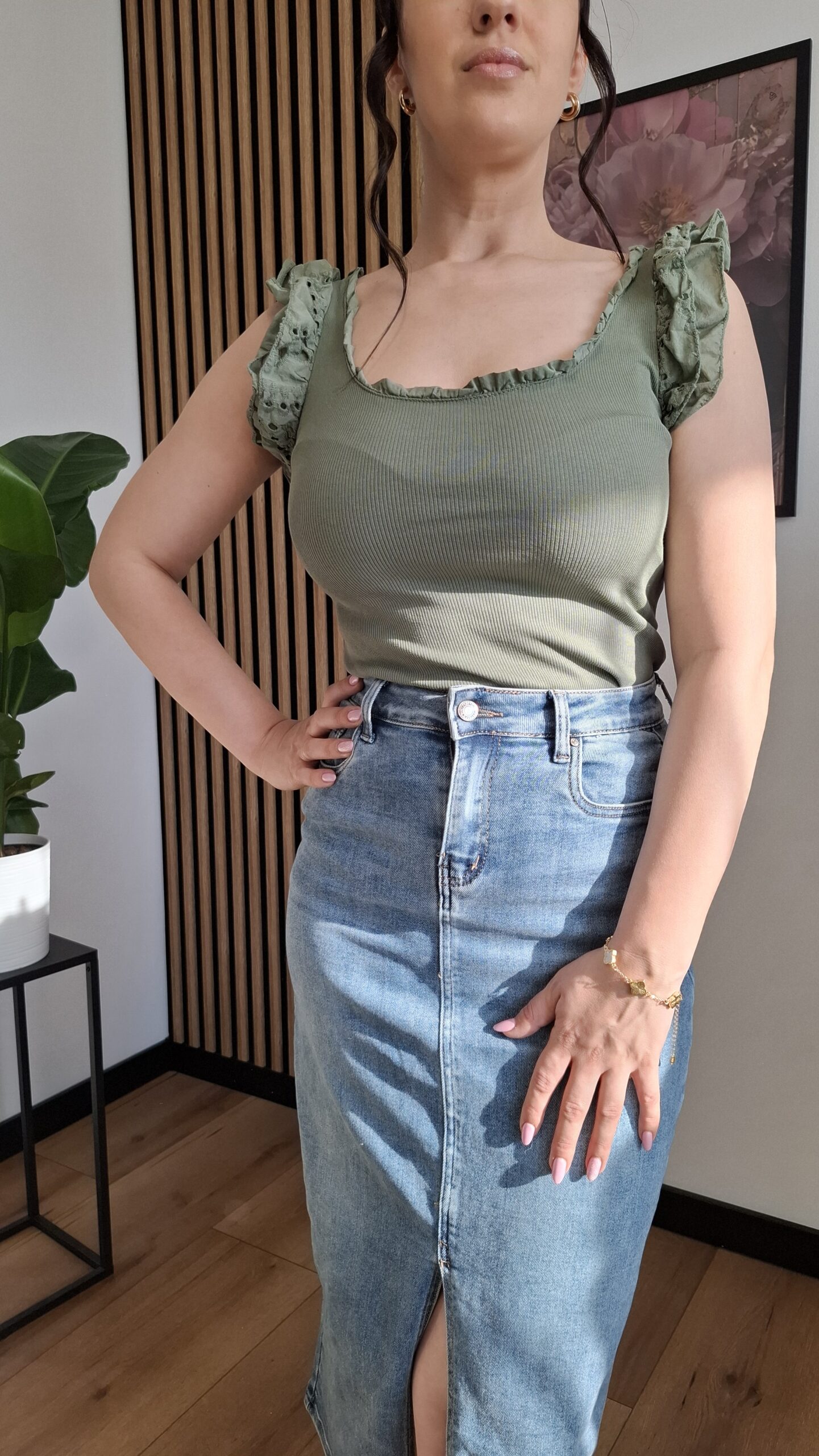 Lekka i przewiewna bluzka wykonana z bawełny, idealna na cieplejsze dni. Model bez rękawów z uroczą falbanką przy ramionach oraz efektownym, ażurowym tyłem, który dodaje całości delikatności i wyjątkowego charakteru.