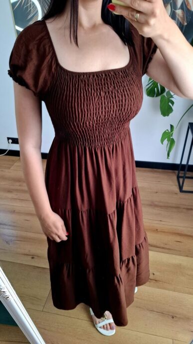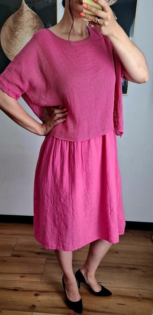 Wyjątkowa sukienka do kolan wykonana z miękkiej, oddychającej bawełny, z efektowną siateczką na górze i rękawach. Połączenie naturalnego materiału z delikatną, półprzezroczystą siatką nadaje całości lekkości i subtelnego uroku. Fason idealnie sprawdzi się zarówno na co dzień, jak i na bardziej eleganckie okazje – wystarczy zmienić dodatki.
