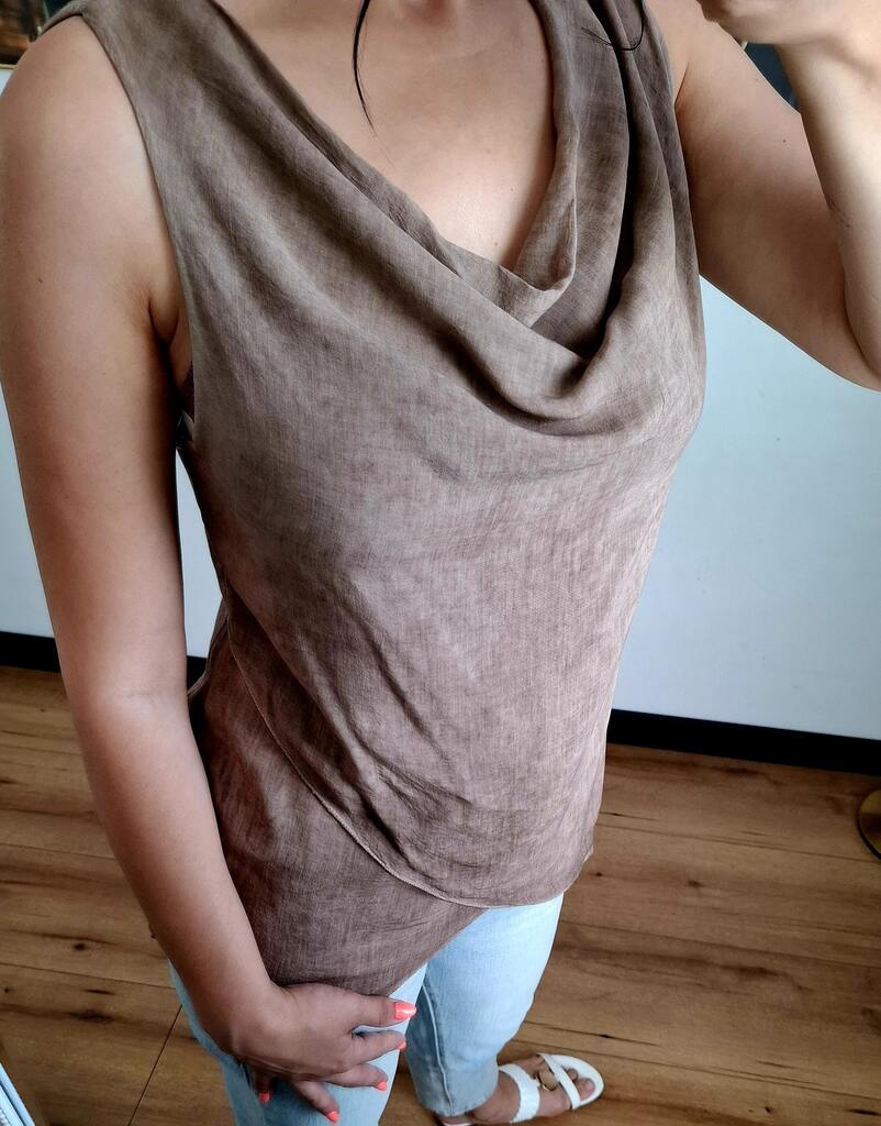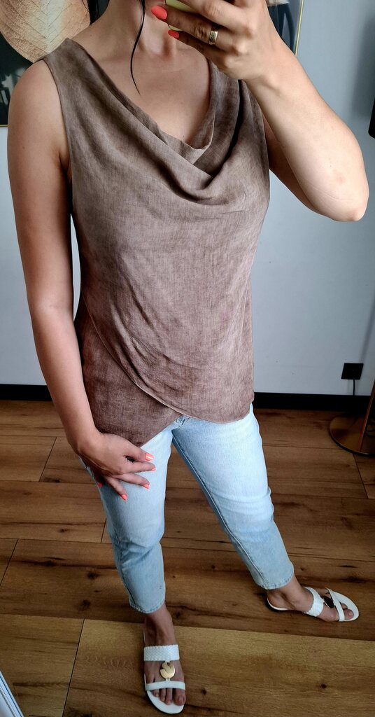 Bluzka „Amelia” to propozycja dla kobiet, które cenią lekkość, naturalność i kobiecy szyk. Uszyta z miękkiej, lejącej wiskozy, delikatnie układa się na sylwetce, a dekolt typu woda dodaje jej zmysłowego uroku. Brak rękawów sprawia, że bluzka jest idealna na cieplejsze dni, a jej uniwersalny fason świetnie komponuje się z eleganckimi i casualowymi stylizacjami.