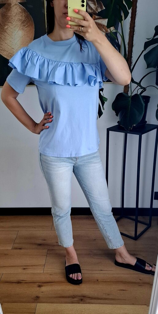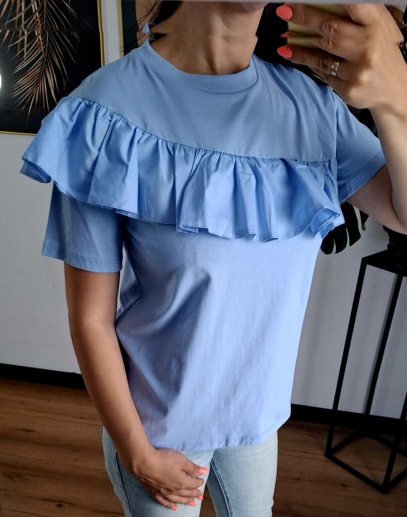 Bluzka bawełniana z falbaną na ramionach błękitna