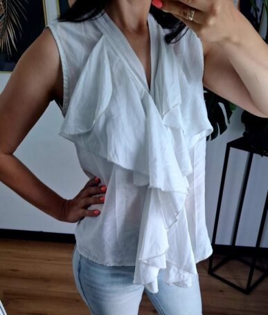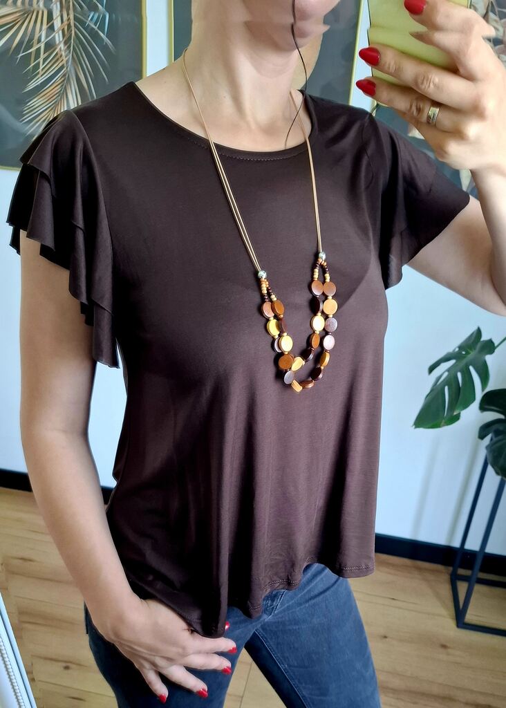 Bluzka „Cocoa Flow” to lekki, miękki model wykonany z wysokiej jakości lyocellu – tkaniny przyjaznej skórze i środowisku. Delikatny brązowy odcień w połączeniu z falbanami na rękawkach tworzy subtelną, a jednocześnie stylową całość. Luźny krój zapewnia wygodę i świetnie układa się na sylwetce.