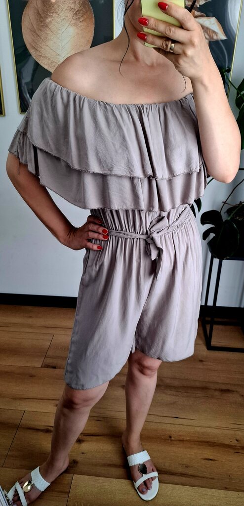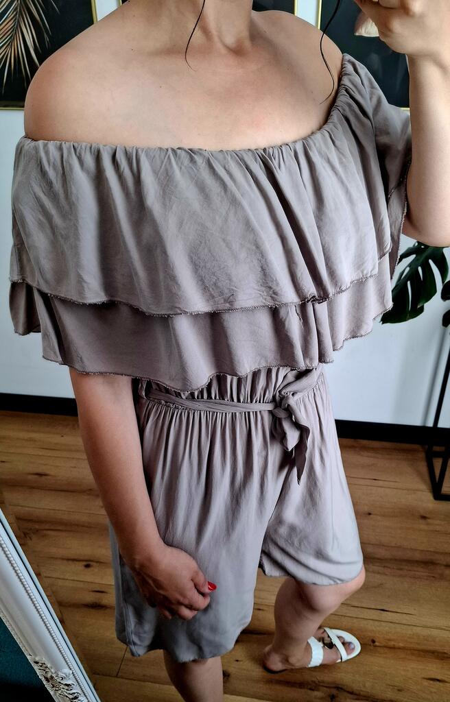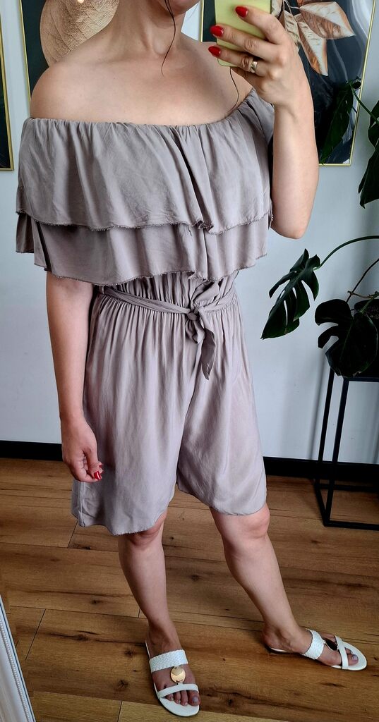 to idealna propozycja na ciepłe dni – uszyty z przewiewnej wiskozy, zapewnia komfort i swobodę ruchów. Odkryte ramiona w stylu hiszpańskim dodają kobiecego uroku, a elastyczna talia pięknie podkreśla sylwetkę. Krótkie nogawki sprawiają, że całość wygląda świeżo i wakacyjnie.