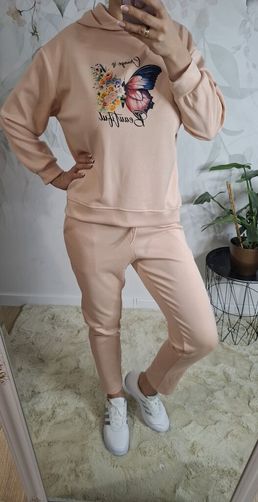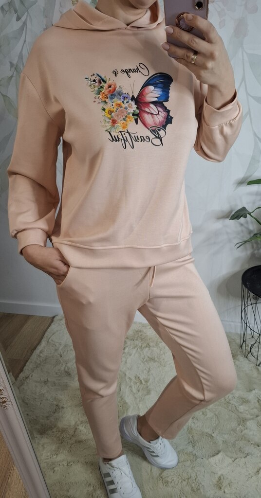 Ten wyjątkowy komplet dresowy w modnym odcieniu masełkowym to połączenie wygody i subtelnej elegancji. Bluza ozdobiona motywem motyla dodaje uroku, a miękki materiał zapewnia komfort noszenia. Idealny wybór na codzienne stylizacje, spacery czy domowy relaks!