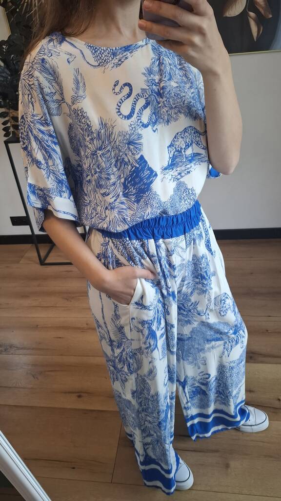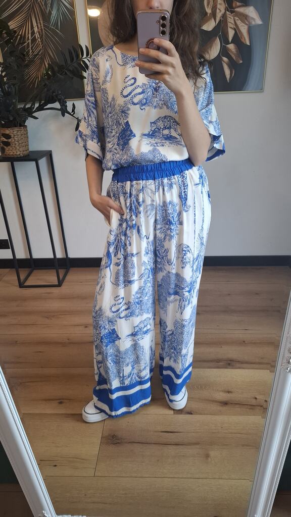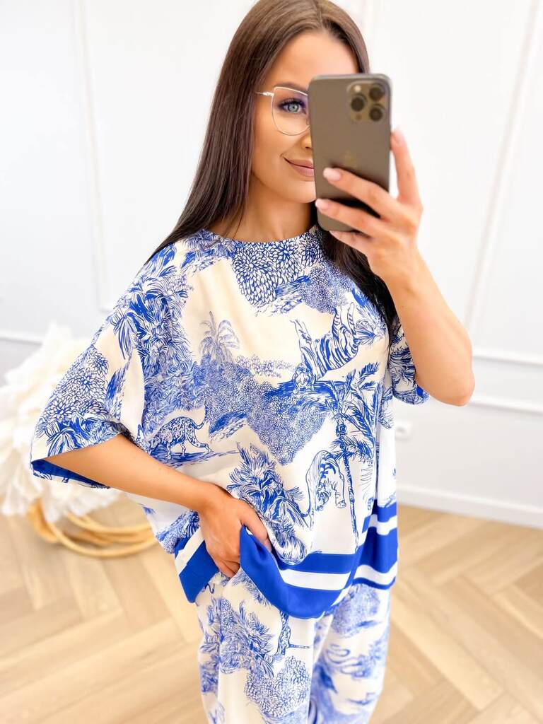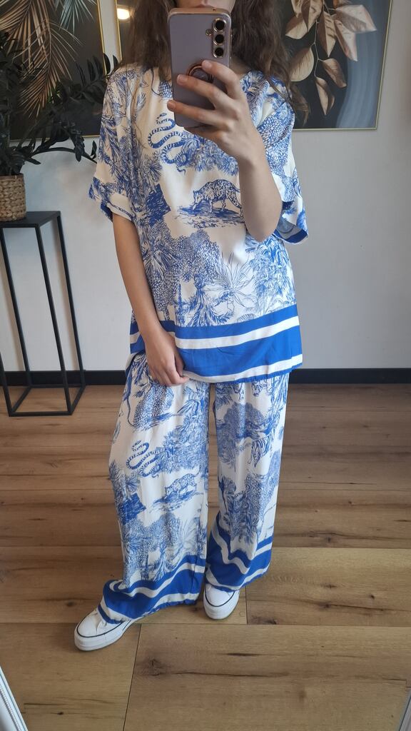 Stylowy komplet wykonany z lekkiej, przewiewnej wiskozy to absolutny must-have na ciepłe dni! Połączenie luźnej bluzki i szerokich spodni w orientalny, roślinno-zwierzęcy wzór tworzy efektowną, a jednocześnie komfortową stylizację. 🌿🦓