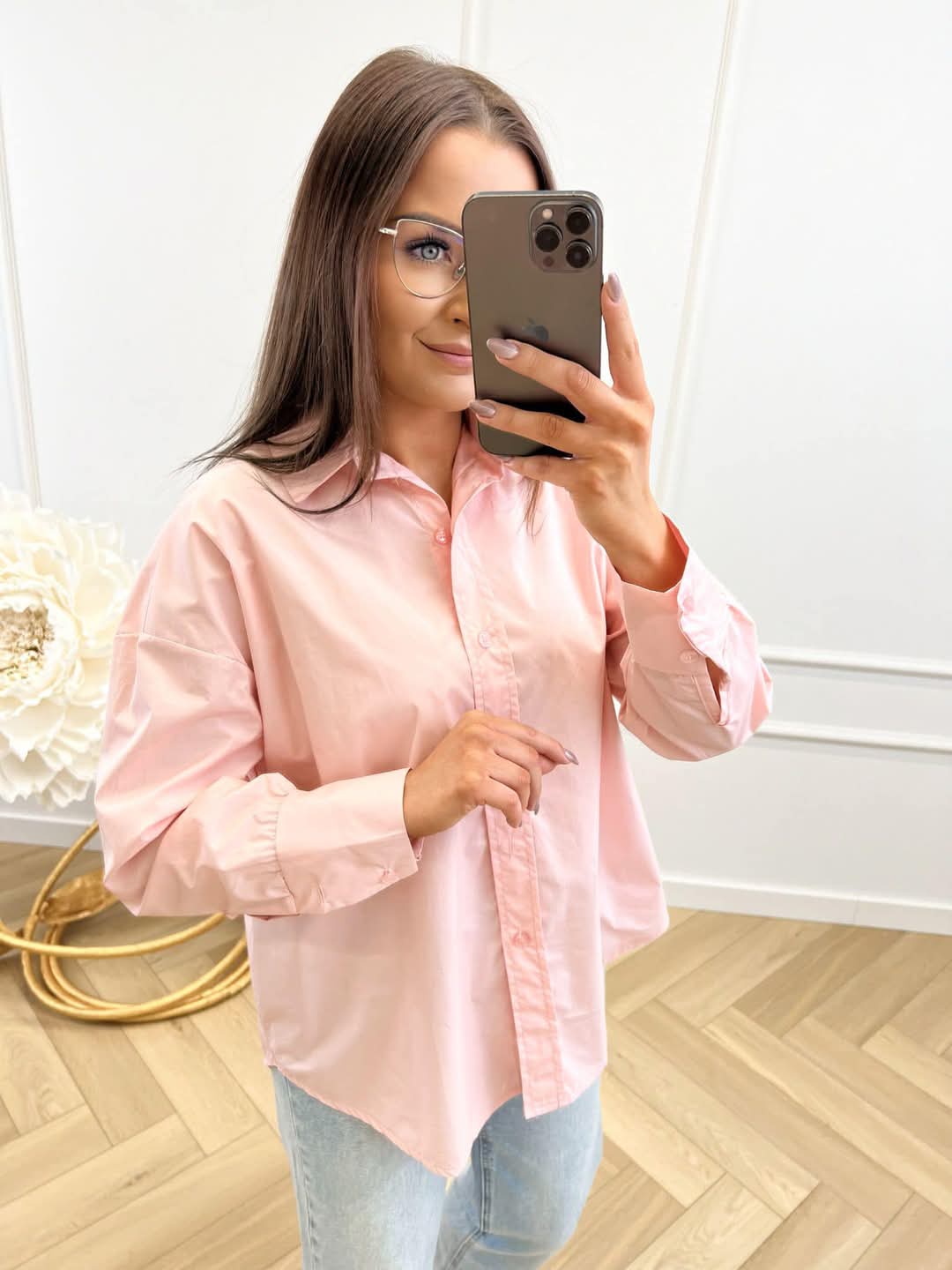 Stylowa, oversize’owa bluzka koszulowa w delikatnym, pudroworóżowym kolorze. Wykonana z lekkiej, przyjemnej w dotyku tkaniny – idealna na co dzień i do pracy. Model z klasycznym kołnierzykiem, długimi rękawami zakończonymi mankietem i zapięciem na guziki na całej długości. Asymetryczny dół nadaje nowoczesnego charakteru i świetnie prezentuje się zarówno wpuszczony do spodni, jak i noszony luźno.