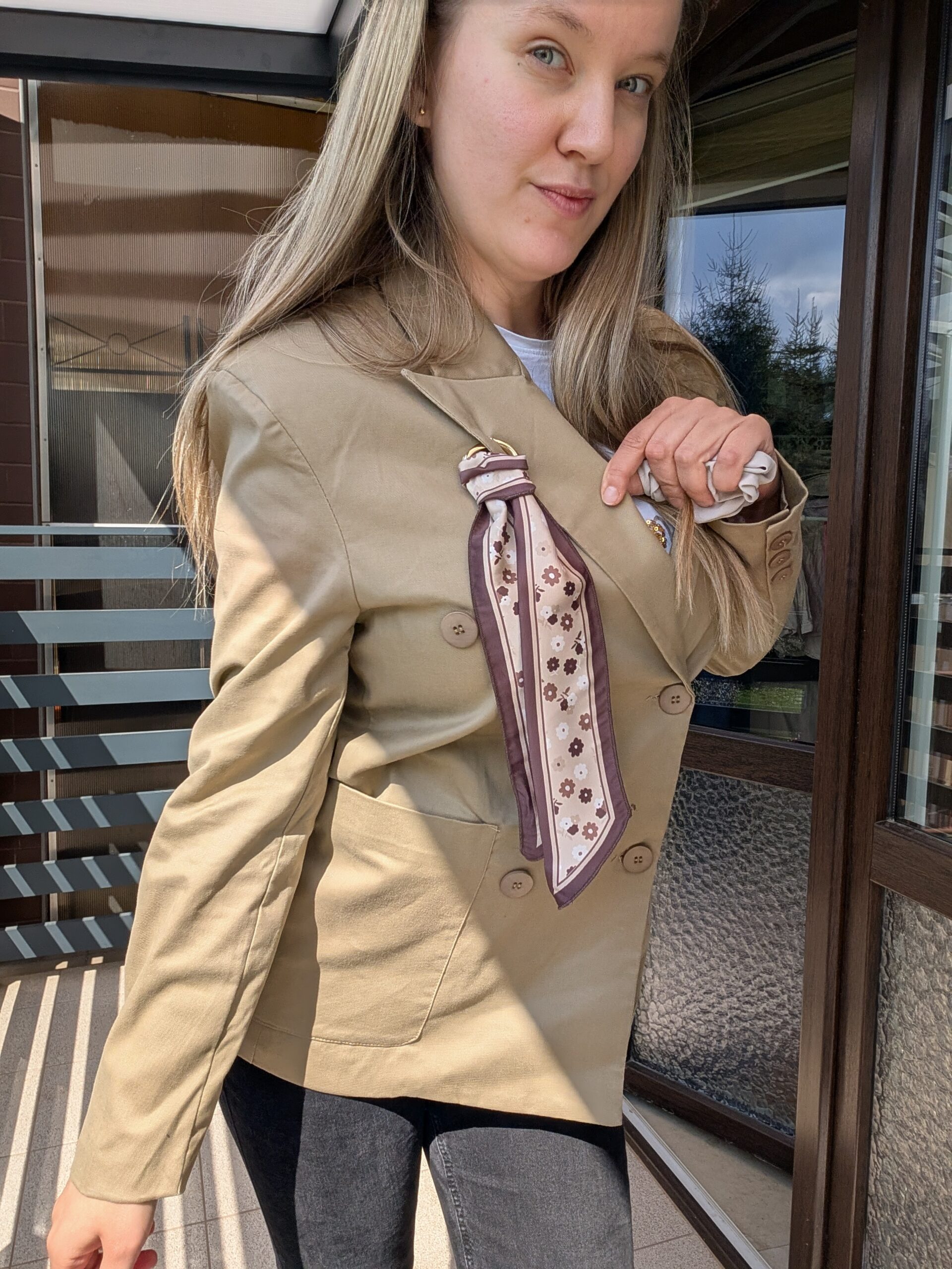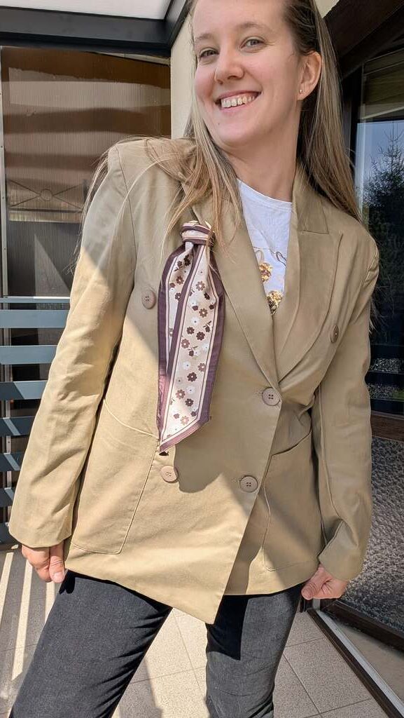 Beżowa marynarka z wiązaną chustką 🤎