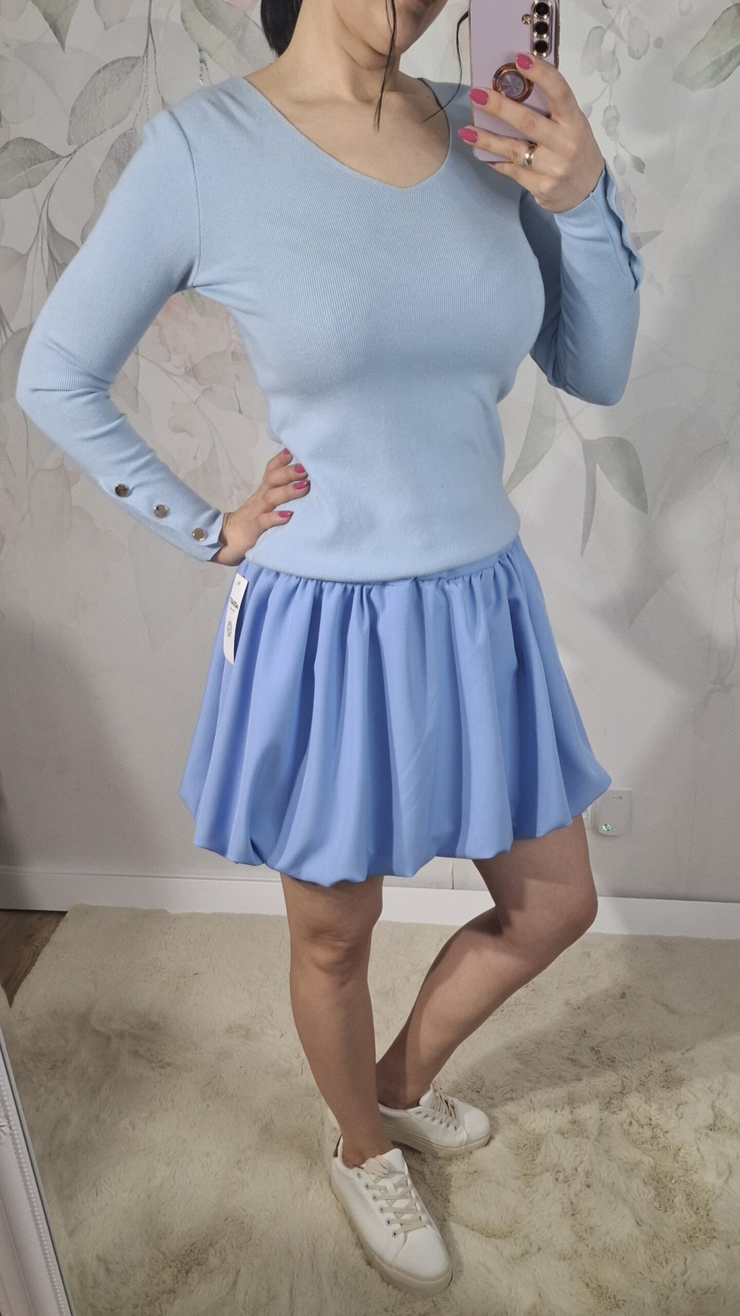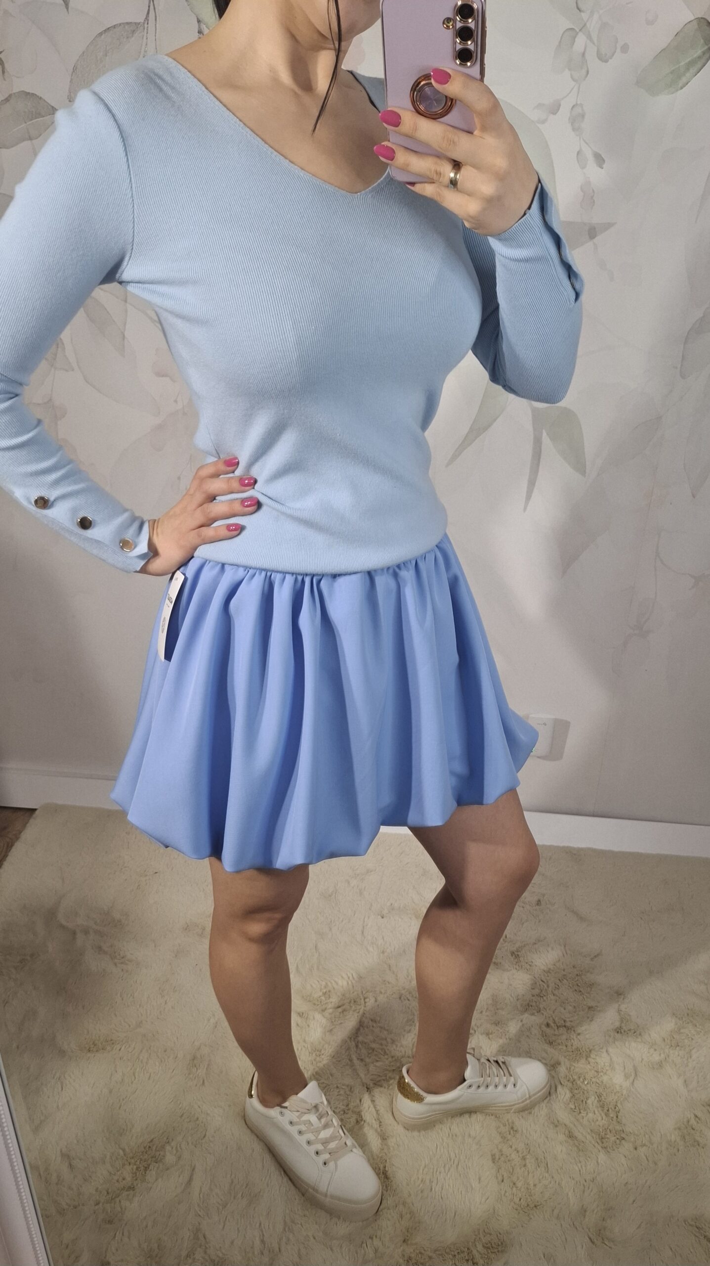 🌸 Urocza i stylowa niebieska mini o rozkloszowanym kroju.