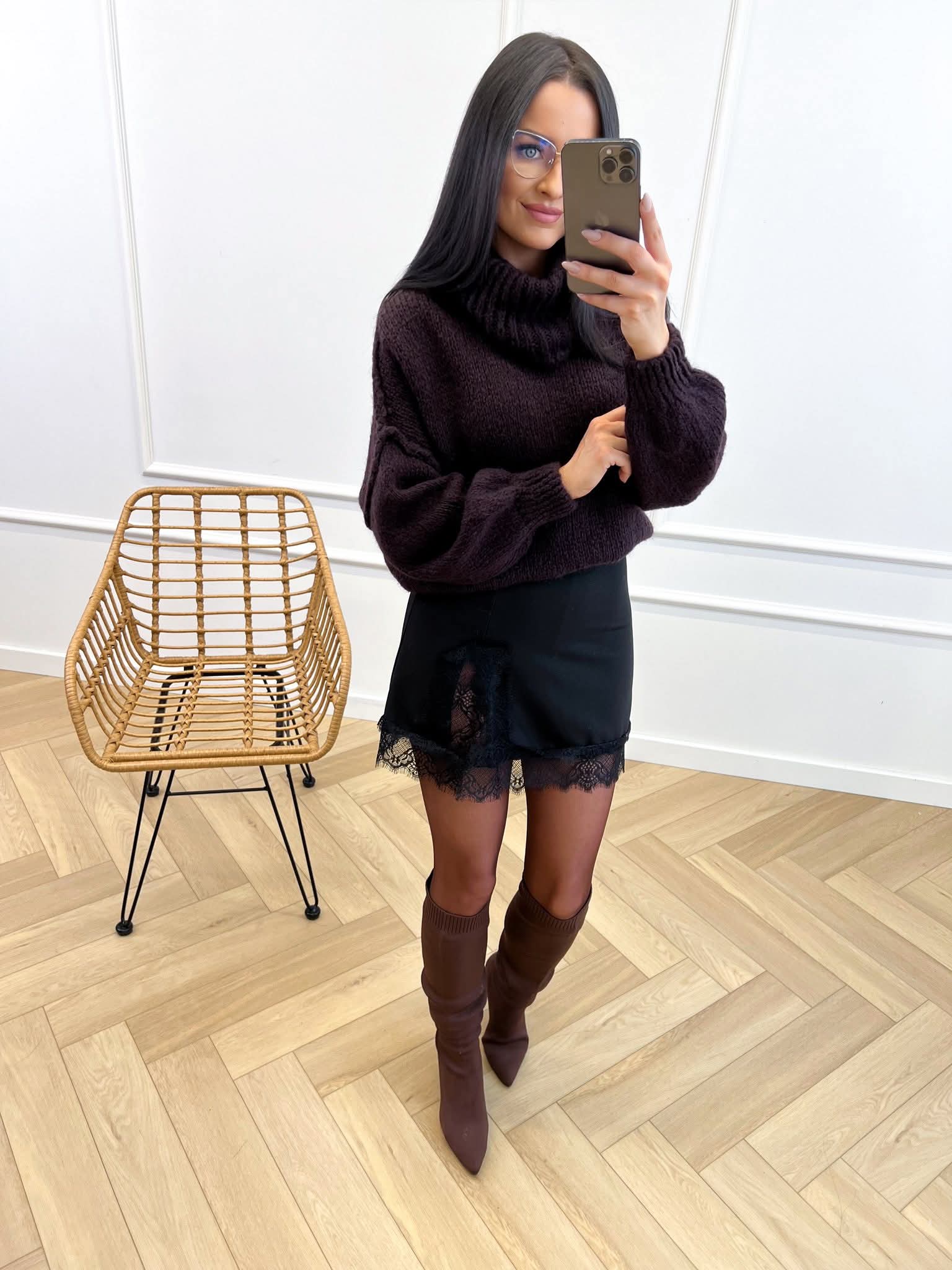 Kobieca i efektowna mini spódnica ozdobiona delikatną koronką wzdłuż dolnej krawędzi. Model ma dopasowany fason, który podkreśla sylwetkę i dodaje całości subtelnie zmysłowego charakteru. Koronkowe wykończenie nadaje spódnicy elegancji oraz lekko romantycznego akcentu.
