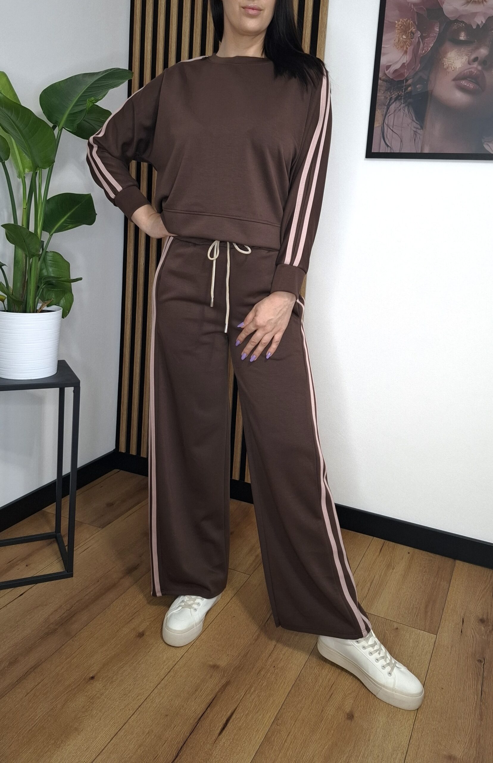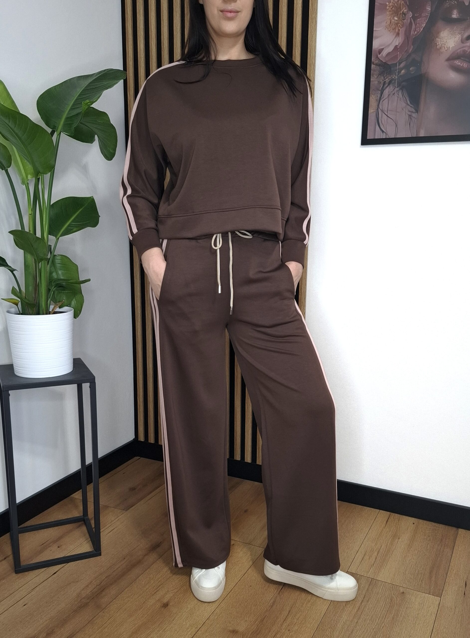 Modny i wygodny komplet dresowy w eleganckim odcieniu brązu z kontrastowymi, jasnoróżowymi lampasami. Idealny na co dzień, spacery, podróże oraz casualowe stylizacje.