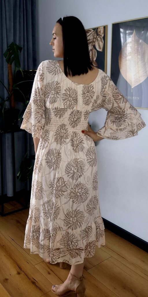 👚 Krótki rękaw, delikatny materiał w kolorze biało-beżowym dodaje sukience elegancji i świeżości.