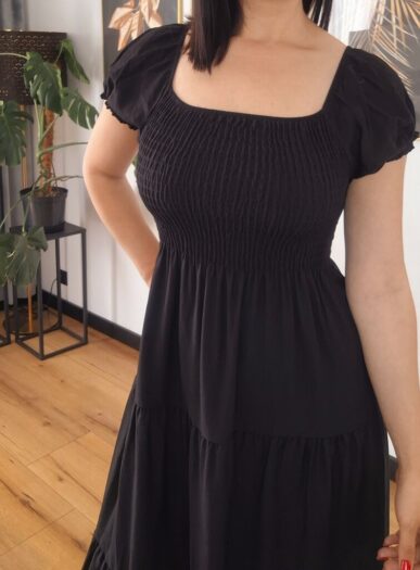 Model z delikatnym dekoltem w serek, ozdobnym rzędem guziczków oraz rozcięciem na nodze, które subtelnie podkreśla sylwetkę. Rękawy zakończone lekkim ściągaczem dodają całości lekkości, a elastyczna talia pięknie akcentuje kobiece kształty.