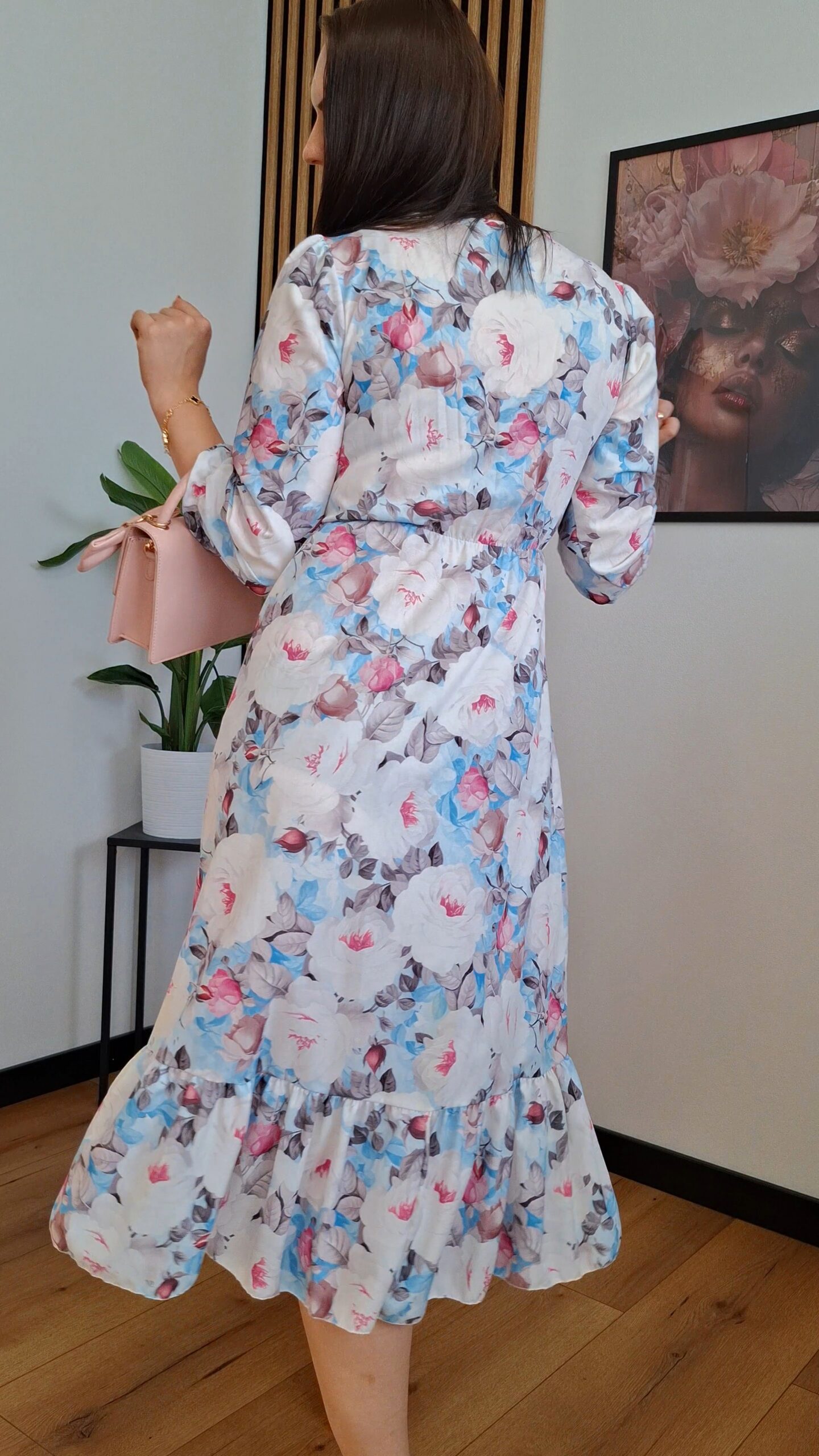 Sukienka „Julia” to kwintesencja kobiecości i lekkości. Wykonana w 45% z przewiewnej wiskozy, gwarantuje komfort noszenia nawet w najcieplejsze dni. Zjawiskowy, kwiatowy print w pastelowych odcieniach błękitu, bieli nadaje jej romantycznego uroku.