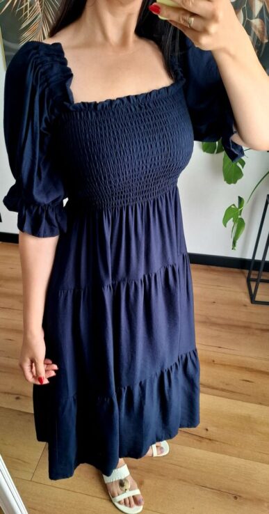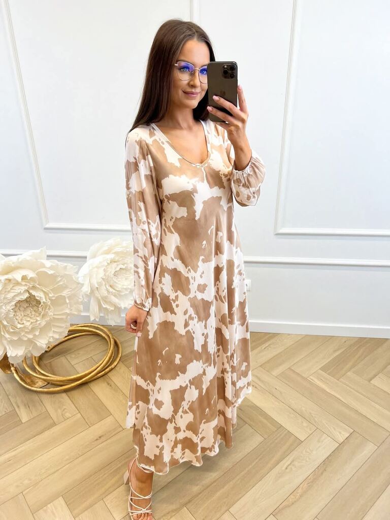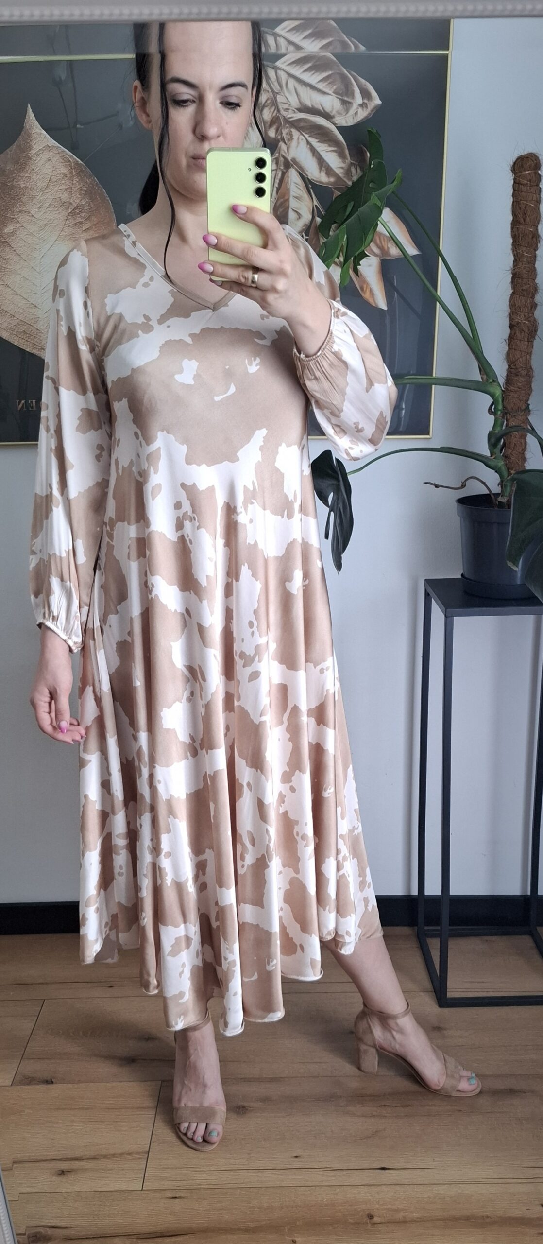 Długa sukienka w wzór „krówka” Modna tego sezonu – elegancka, rozkloszowana kreacja, która idealnie nadaje się na wiele okazji. Wzór w cętki przypominające umaszczenie krowy dodaje jej charakteru i wyjątkowości. Sukienka świetnie łączy casualowy i elegancki look, co sprawia, że można ją nosić na wesela, imprezy, a także na mniej formalne wyjścia.