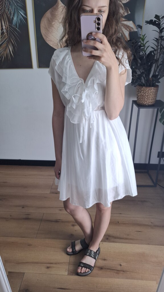 Przepiękna sukienka biała, która podkreśla naturalne piękno i dodaje klasy każdej stylizacji. Delikatne falbanki i subtelne wiązanie z przodu nadają jej dziewczęcego uroku i lekkości. 💚