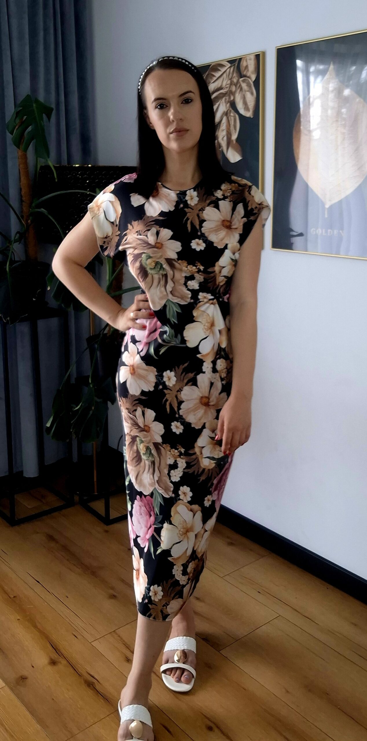 🌸 Elegancka długa sukienka w kwiaty – czarna, śliska tkanina 🌸