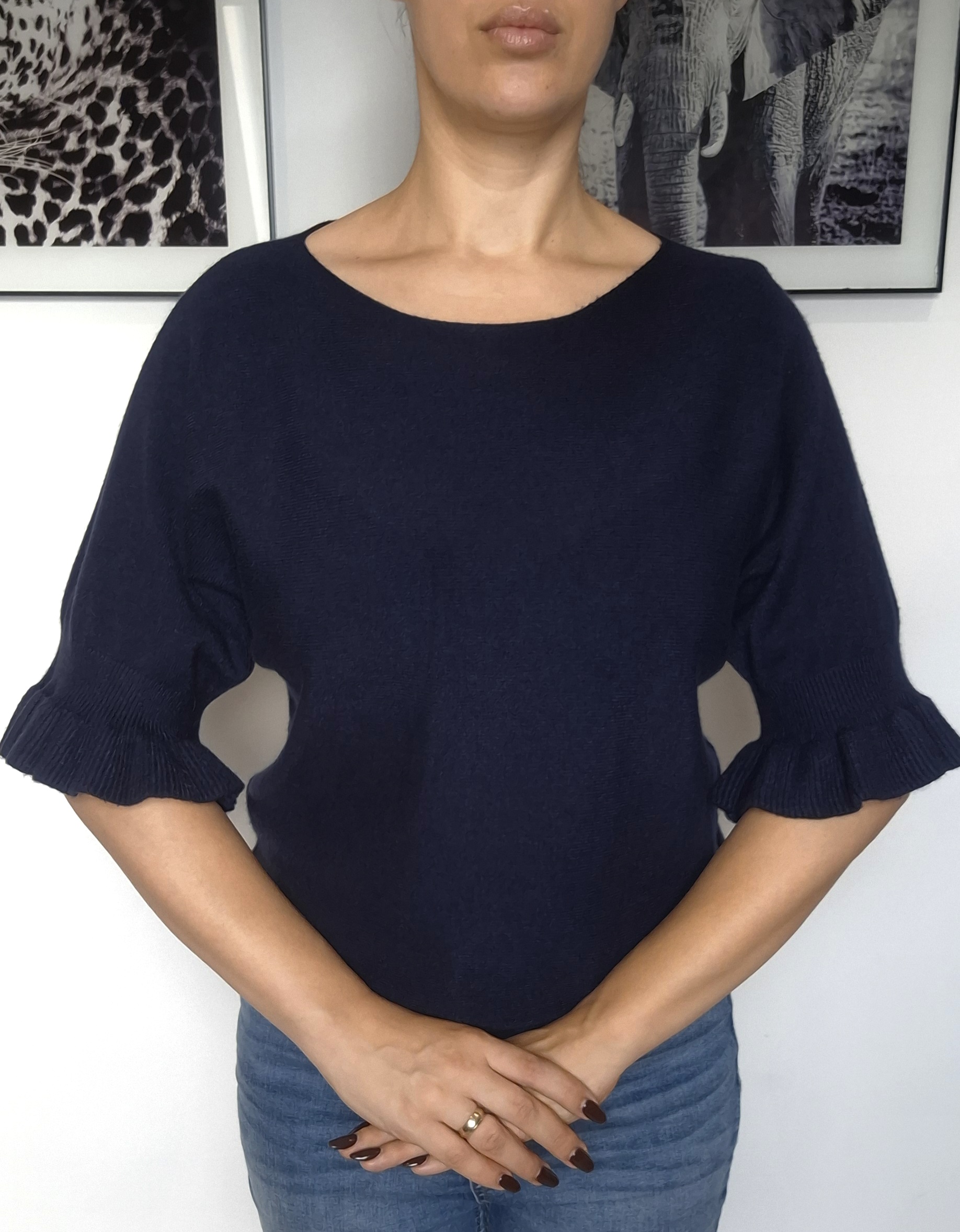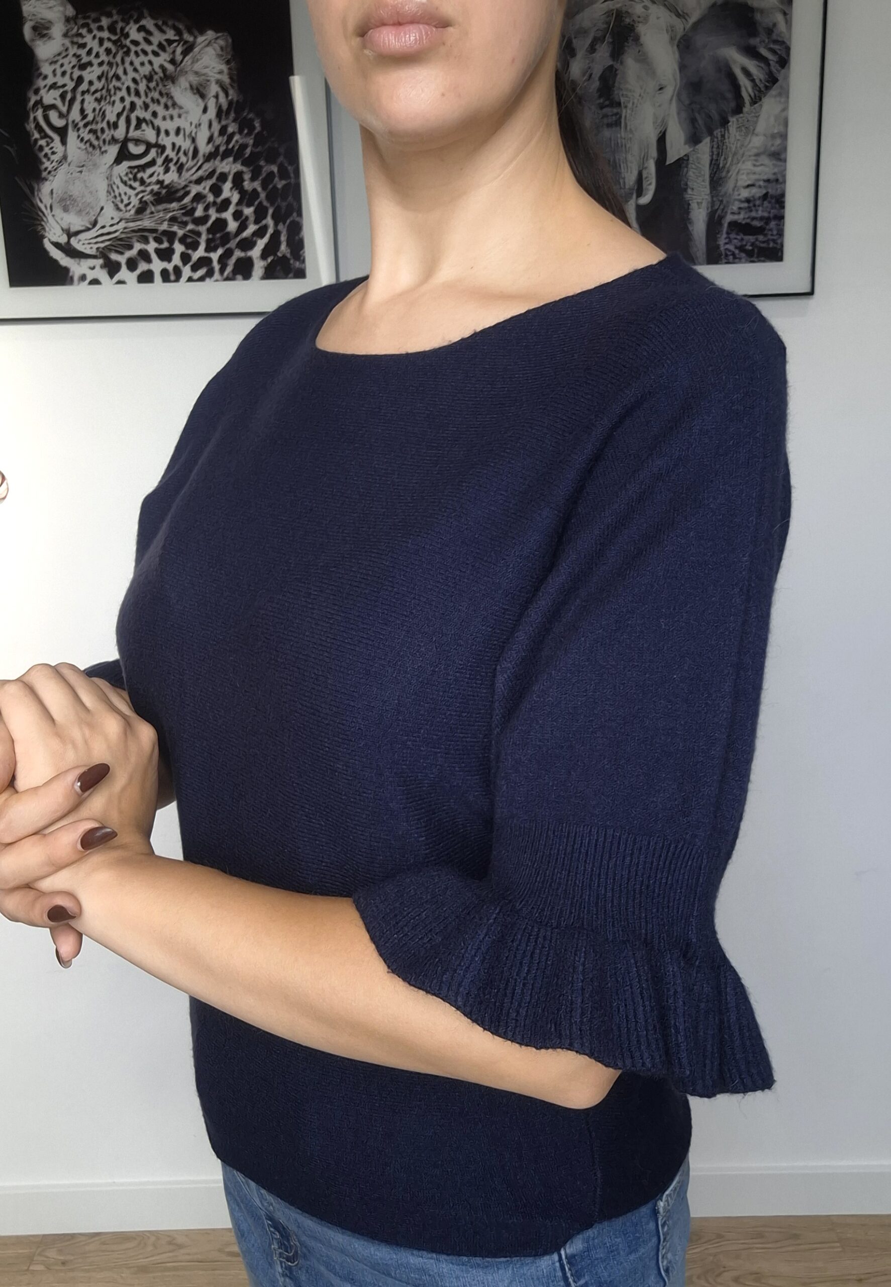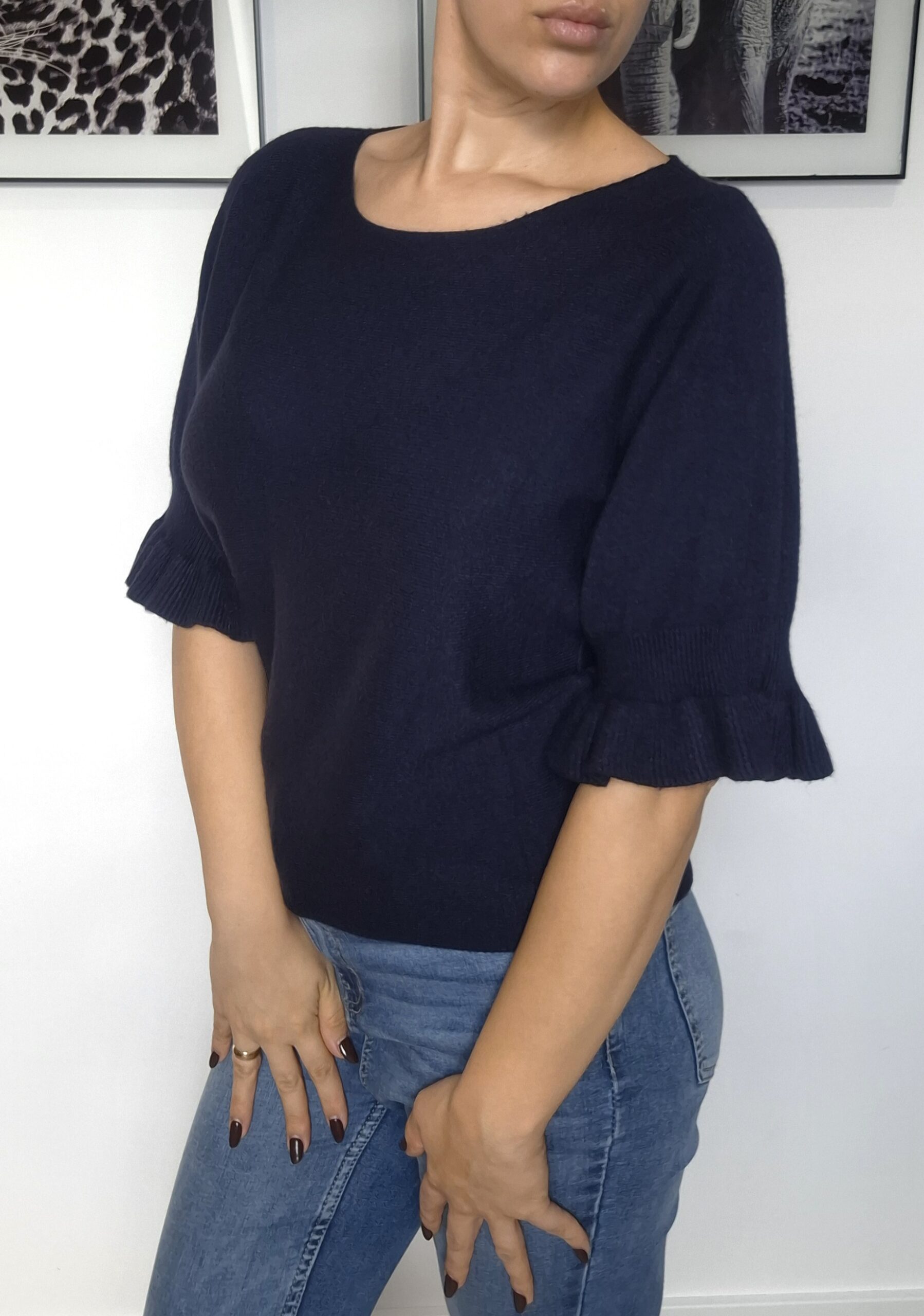 Sweter Belle to połączenie kobiecego detalu i codziennej wygody. Delikatnie rozszerzane rękawy wykończone falbanką nadają mu wyjątkowego charakteru, a 50% wiskozy w składzie sprawia, że jest miękki, lejący i przyjemny w noszeniu.