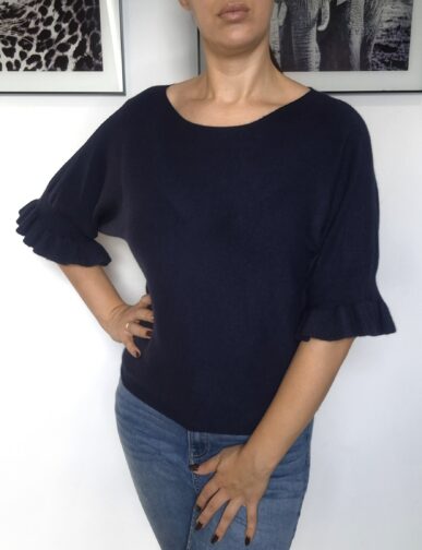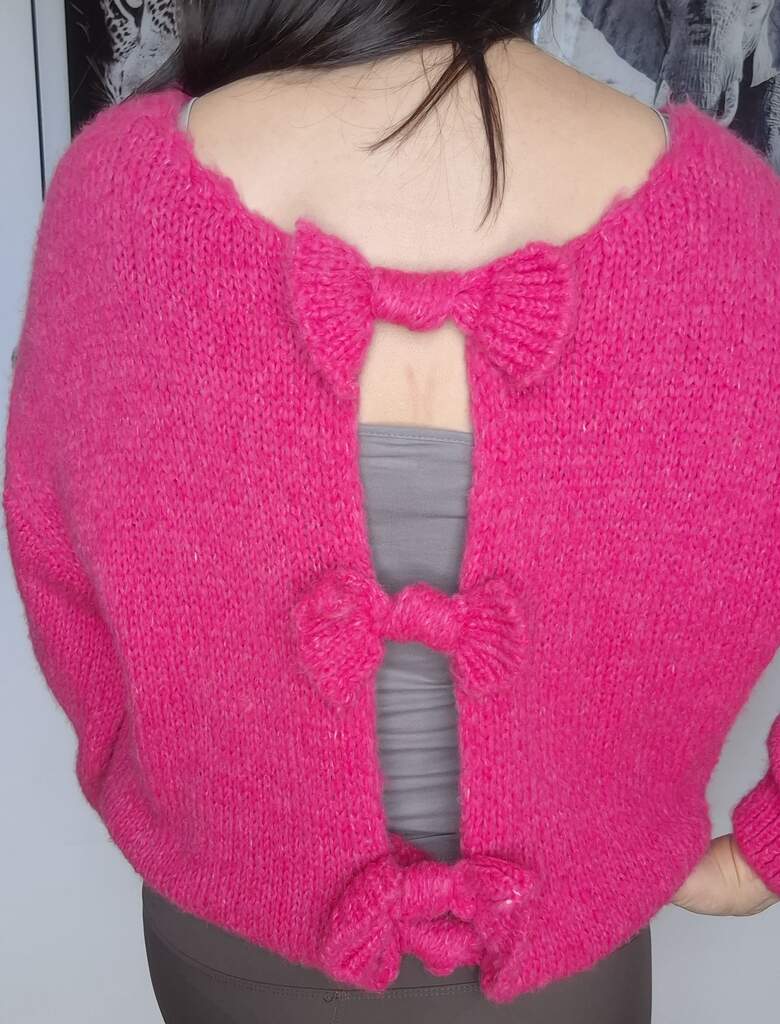 Elegancki sweter z unikalnym akcentem – różowymi kokardkami umieszczonymi na plecach, które dodają mu uroku i wyjątkowego charakteru. Wykonany z miękkiego, przyjemnego w dotyku materiału, zapewnia komfort noszenia przez cały dzień. Klasyczny krój z nutą romantyczności sprawdzi się zarówno w codziennych stylizacjach, jak i na bardziej wyjątkowe okazje.
