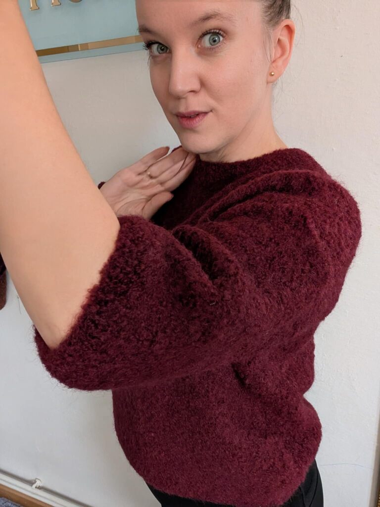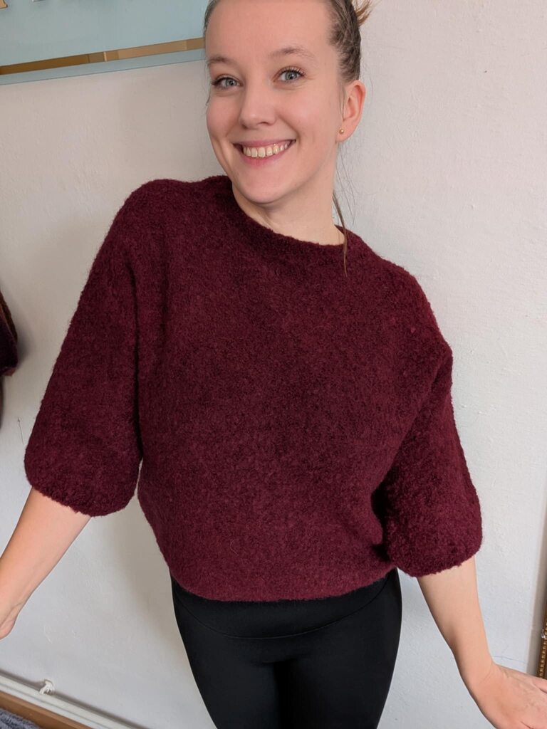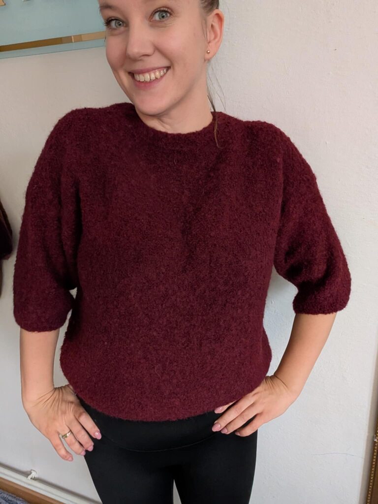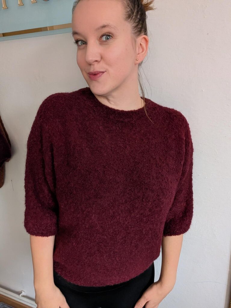 Miękki sweter z krótkim rękawem w kolorze śliwkowym.