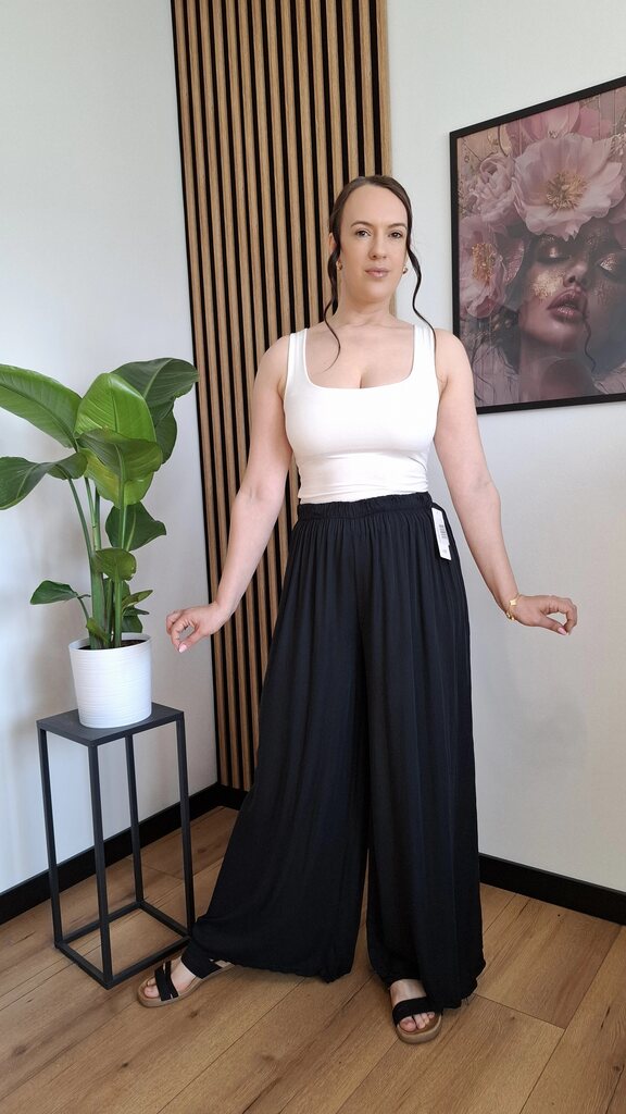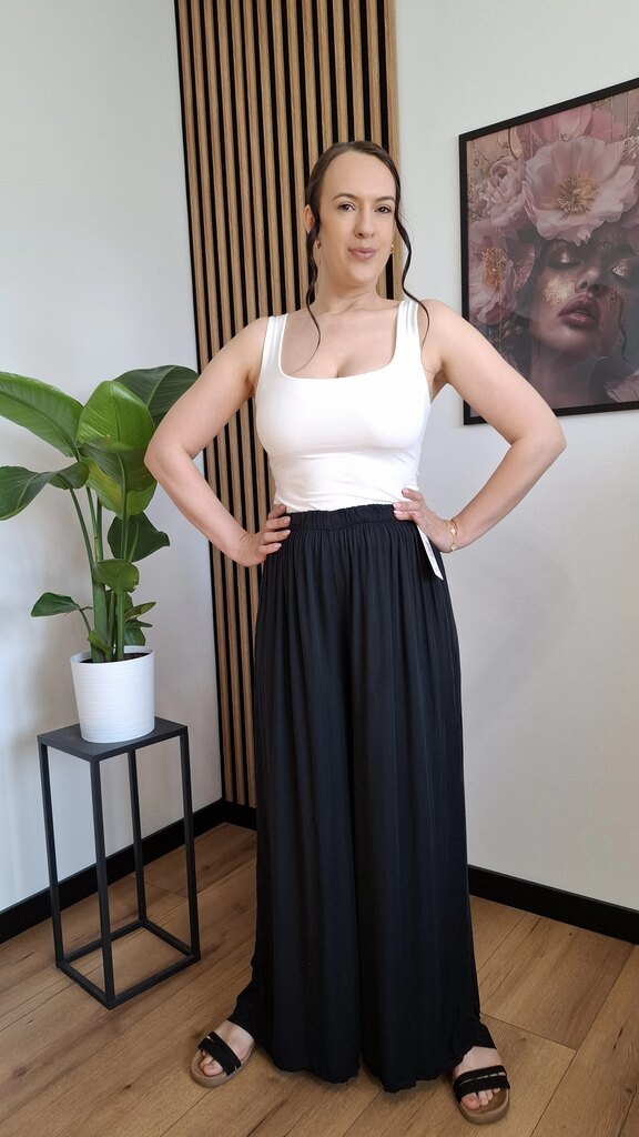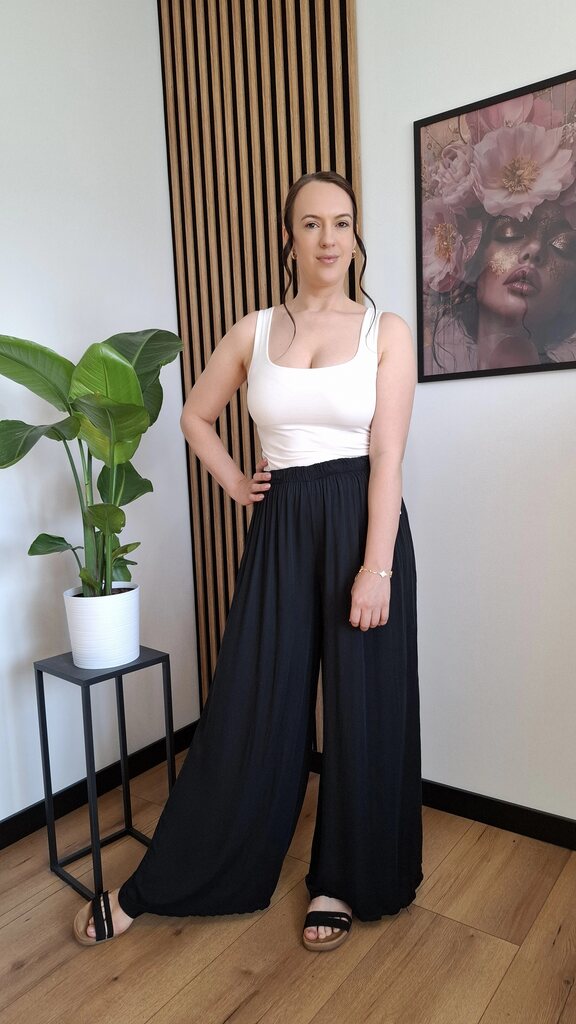 Modne spodnie na gumce, które podbiły trendy! Wykonane w 100% z lekkiej, przewiewnej wiskozy – idealne na cieplejsze dni. Luźny, rozszerzany krój i zwiewny materiał sprawiają, że pięknie układają się w ruchu.